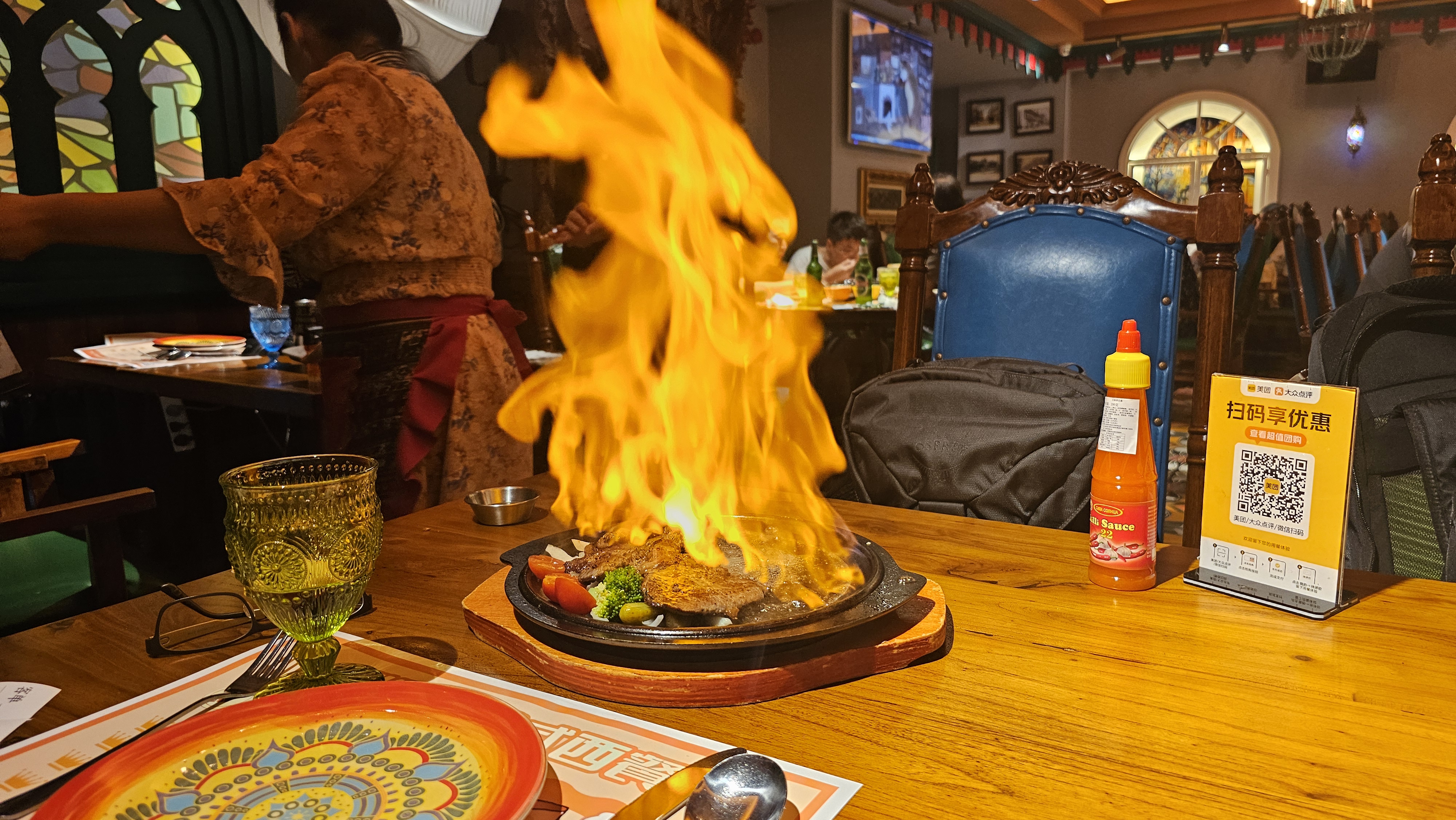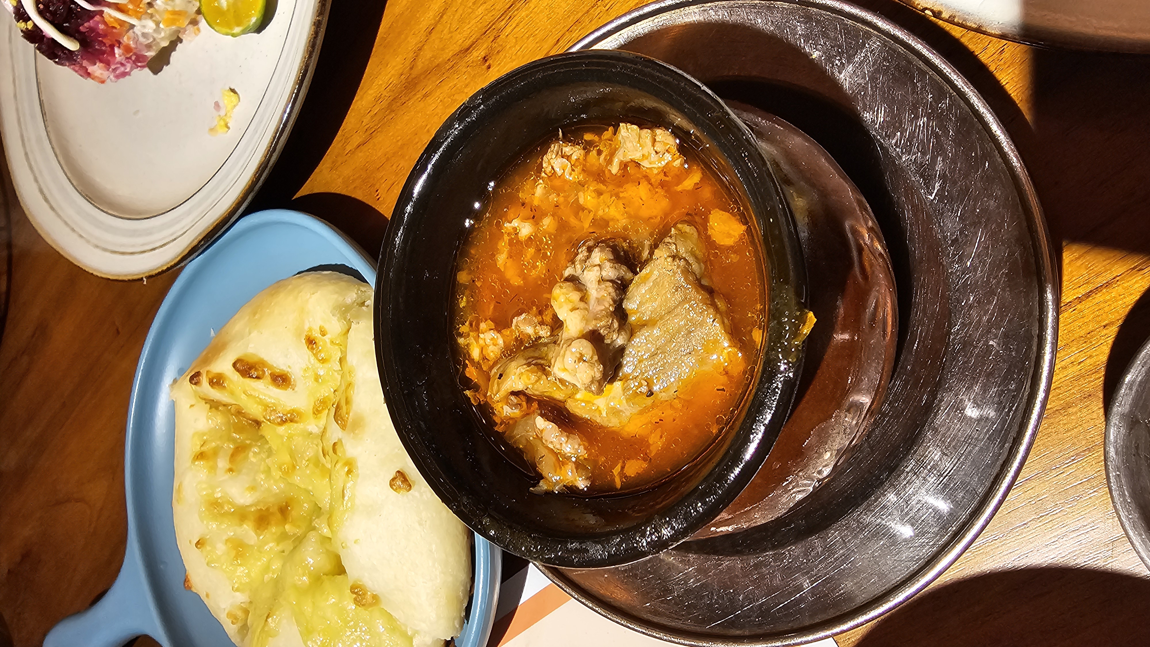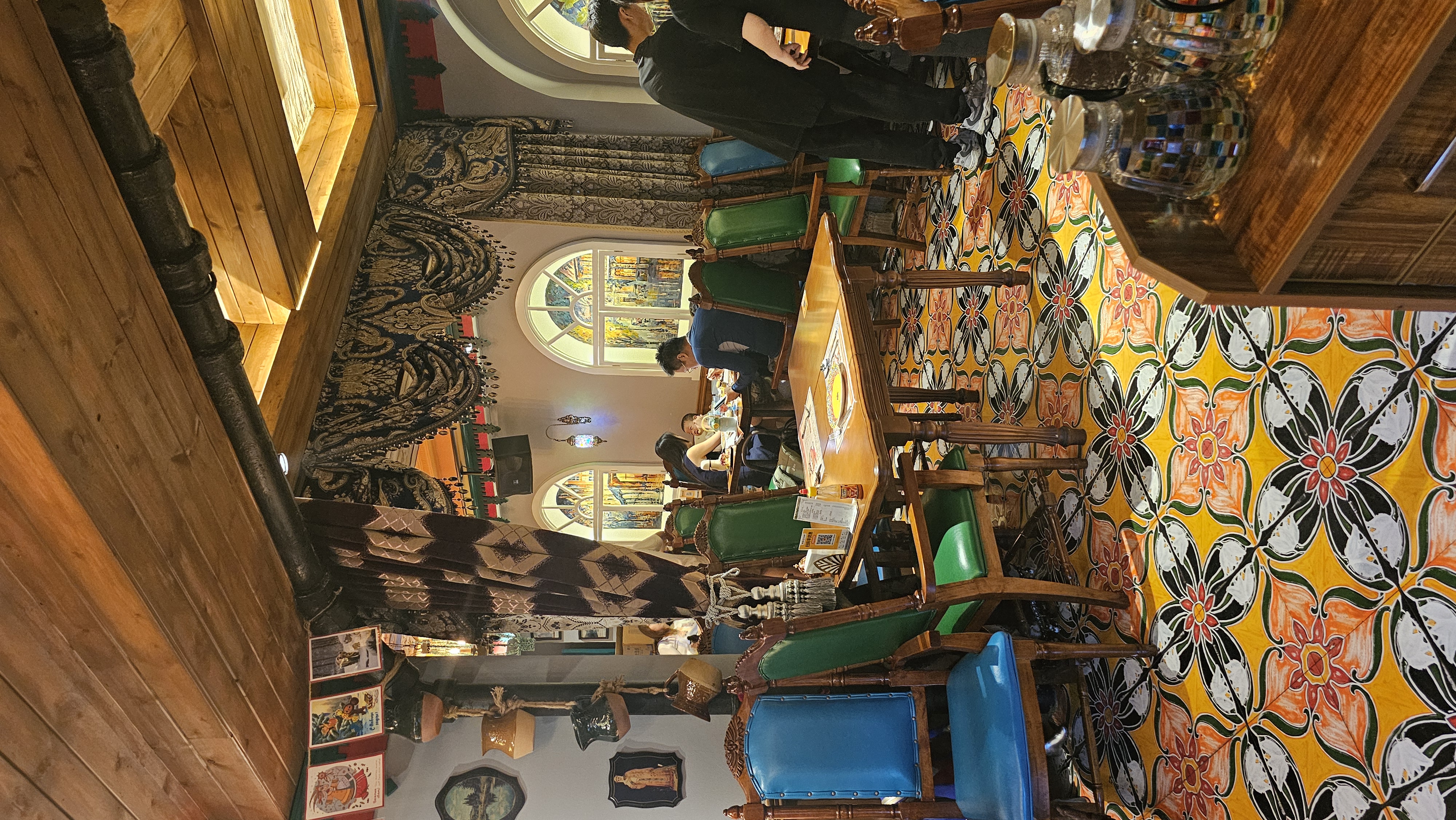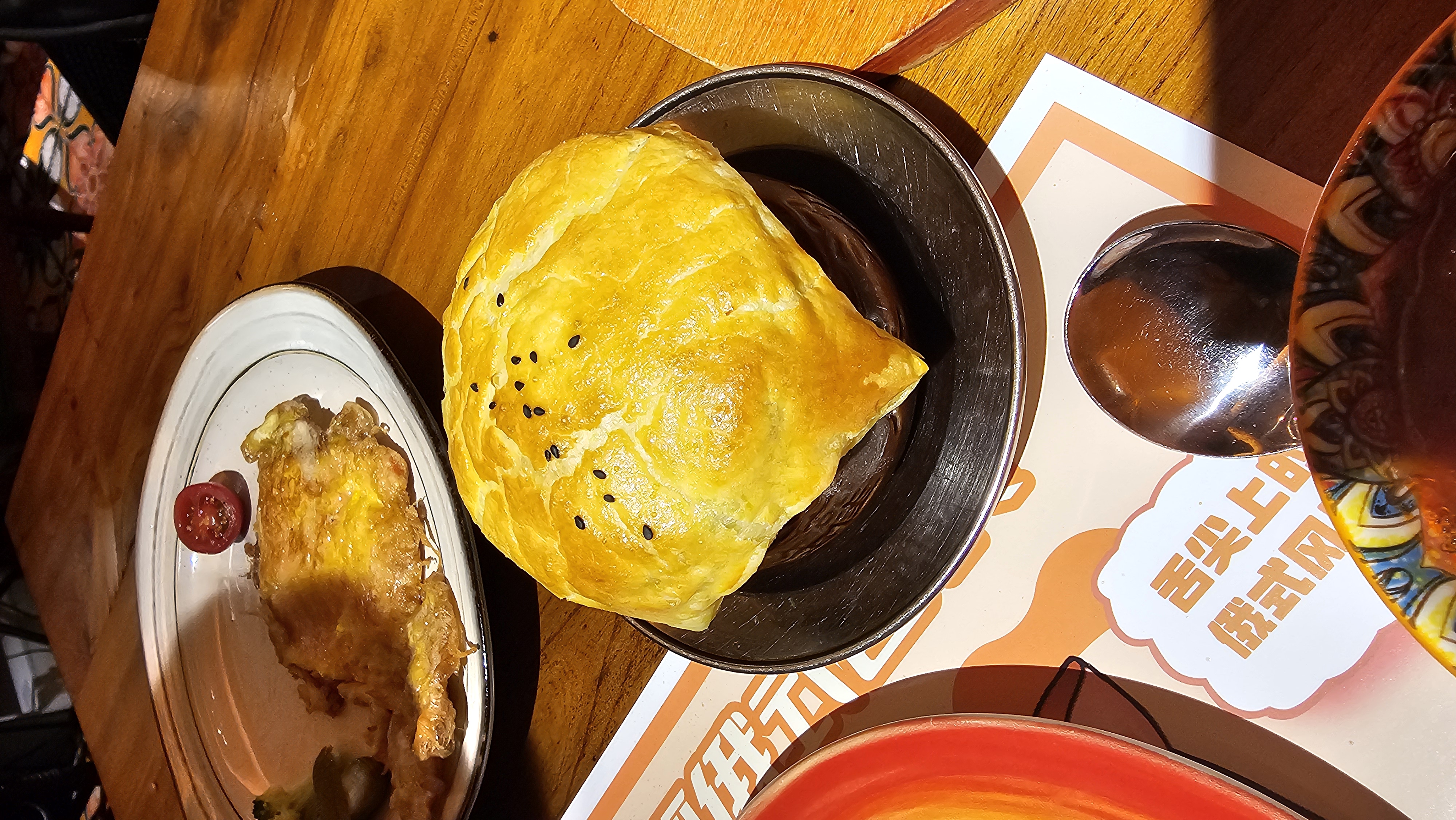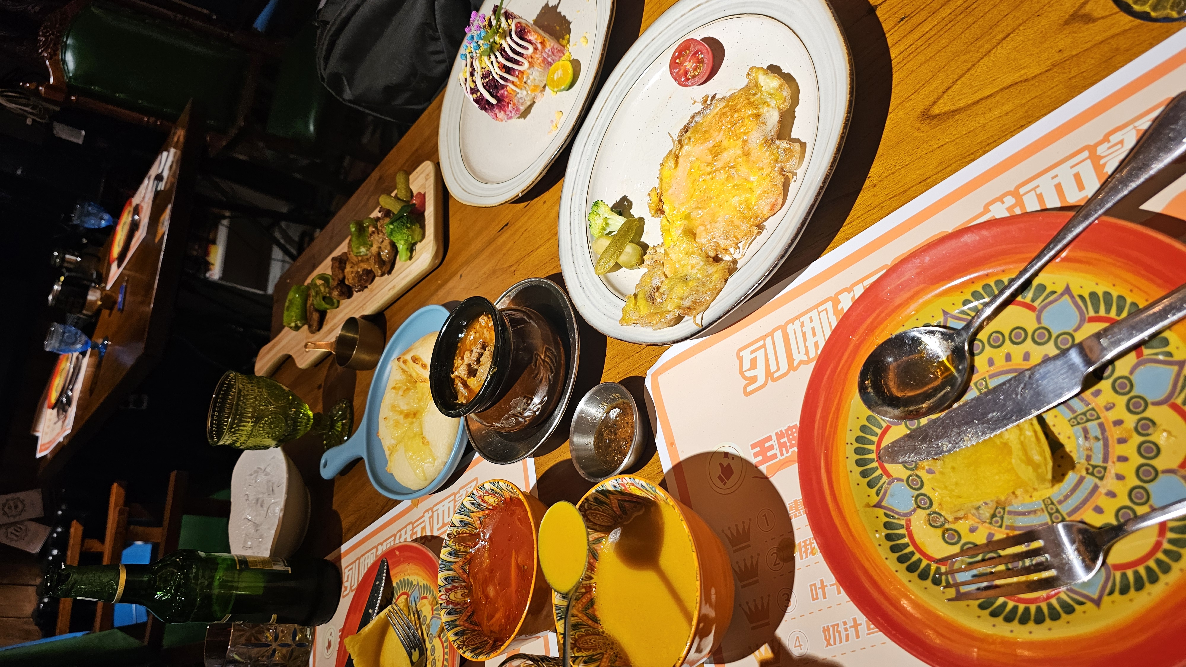 주말이라 그런지 단품 메뉴 없이 세트만 가능하다고 해서 2~3인용 세트(305위안, 여기 물가대비 비쌈)를 주문했다. 세트에는 양고기 꼬치, 감자샐러드, 비트와 마요네즈가 어우러진 러시아식 샐러드, 러시아식 오믈렛, 고기 스튜, 치즈가 올라간 쫄깃한 빵까지 푸짐하게 나왔다. 무엇보다 다양한 색감의 그릇들과 플레이팅이 식사의 즐거움을 한층 더했다.